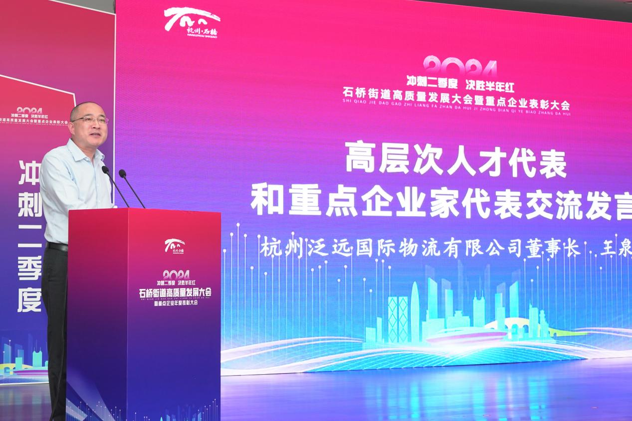此次会议,泛远国际王泉董事长同时受邀作为重点企业家代表发言。王董事长指出泛远国际成立至今20多年,始终扎根拱墅,离不开各级政府的支持与帮助,特别是过去两年多上市过程中,得到区里各相关部门及石桥街道的大力支持。未来,泛远国际将进一步致力于打造稳、快、优的跨境电子商务物流服务体系,让跨境物流更便捷,让全球生意更简单,为中国跨境电子商务的创新与发展,为全区经济高质量发展贡献泛远力量。